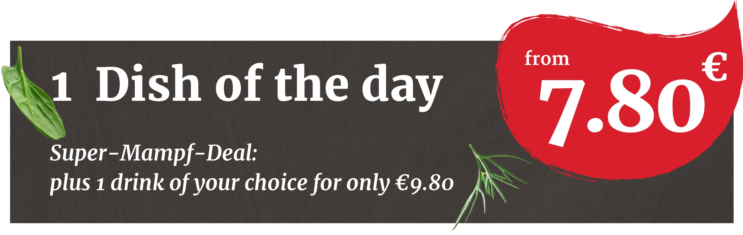 Want to eat fresh, healthy, and delicious food at a reasonable fixed price? This is for smart foodies: from Monday to Friday, between 3 p.m. and 7 p.m., there is a daily special with a side dish for a fixed price of only $7.80. And if you want to save even more, simply order a drink of your choice – for only $9.80 in total. Now, if that isn't a delicious deal...