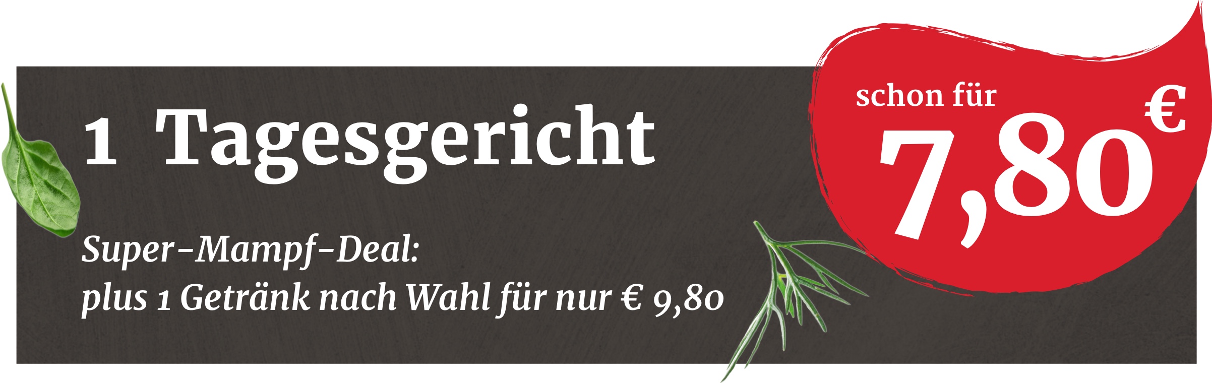 Frisch, gesund und lecker satt werden und das zum günstigen Festpreis? Das ist was für schlaue Genießer: von Montag bis Freitag gib es zwischen 15 Uhr bis 19 Uhr täglich wechselnd ein Tagesgericht mit Beilage zum Festpreis von nur 7,80 EUR. Und wer noch cleverer sparen möchte, bestellt sich einfach ein Getränk nach Wahl dazu – für nur 9,80 EUR insgesamt. Na, wenn das nicht ein Genuss-Deal ist…